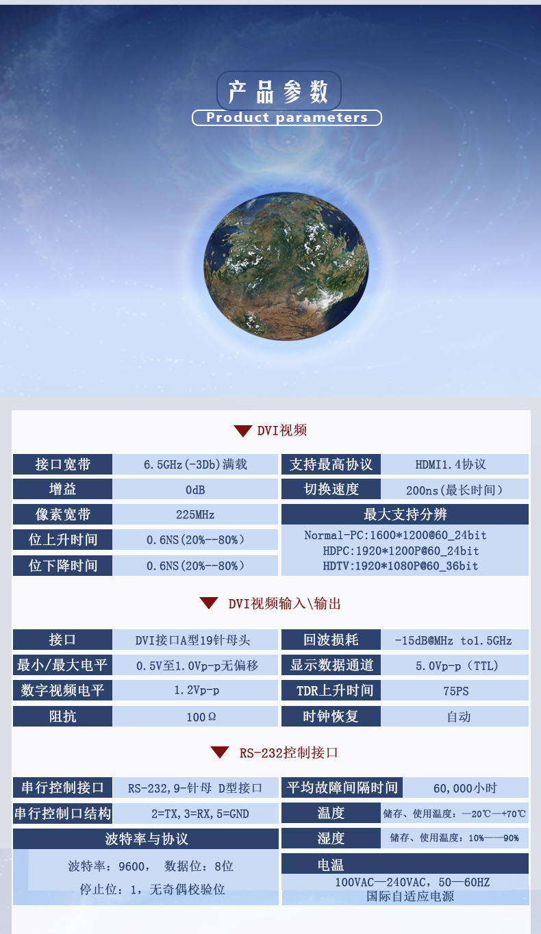 DVI高清全數(shù)字矩陣切換器, 所有端口支持藍光DVD(支持HDCP);輸入輸出自動均衡,輸入加輸出傳輸距離大于40米(不需配帶芯片的DVI線);鋁拉絲面板,帶藍光液晶顯示屏顯示操作狀態(tài);帶串口控制,可選配網(wǎng)口;所有輸入端口支持現(xiàn)場寫EDID,所有輸出端口可讀回EDID。