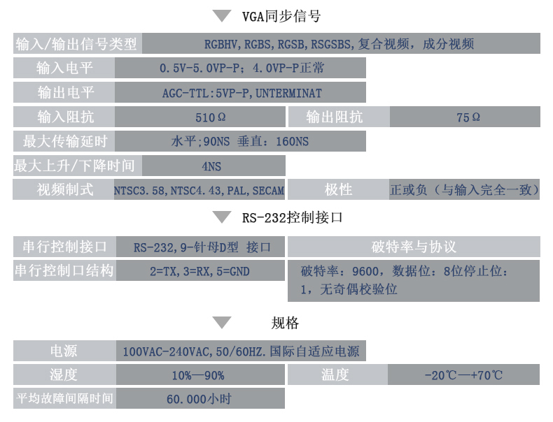 - 支持信號(hào)類型有:VGA、RGBHV、RGBS、RGsB、合視頻、S-視頻、分量視頻。